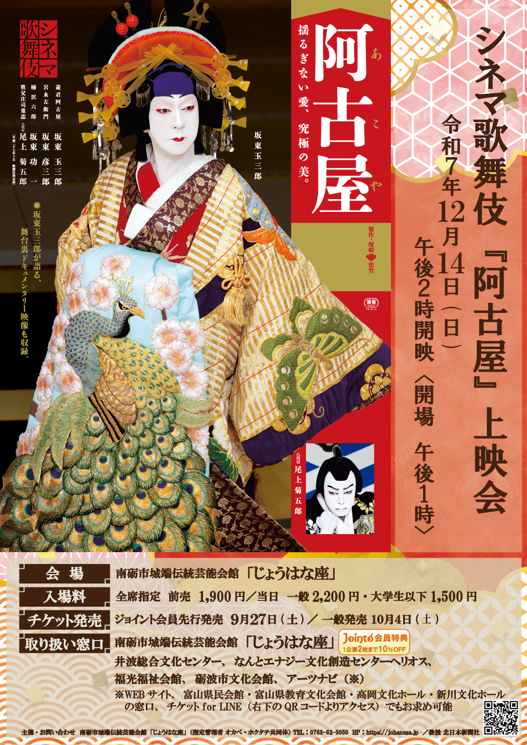 料金 | 全席指定 前売1,900円(当日2,200円) 大学生以下1,500円 ジョイント会員先行発売 9月27日(土)~ 一般発売 10月4日(土)~ ※先行発売はじょうはな座窓口のみとなります。 ※ジョイント会員特典1公演2枚まで10%off ※当日入会OKです! ※未就学児の入場はご遠慮ください。 ※大学生以下は前売・当日ともに同料金【チケット取り扱い窓口】 じょうはな座、ヘリオス、井波総合文化センター、福光福祉会館、砺波市文化会館 アーツナビ チケット for LINE(電子チケット)【チケットforLINEの購入の流れ】 1.購入ページから「チケット購入」を選ぶ → 2.座席を選択する 「料金種別選択」へ進む → 3.選択した座席の料金種別を選択 □利用規約に同意するに✓を入れる → 購入へ進む 4.LINEと連携して購入する※LINE連携が初めての方は友達登録後にログインとなります。 ※じょうはな座のLINEとお友達登録をされるとスムーズです。●指定席のイベントのチケットを購入する方はこちらをご覧ください。 ●自由席のイベントのチケットを購入する方はこちらをご覧ください。 じょうはな座公式LINEお友達募集中!(@592zlmvx) |